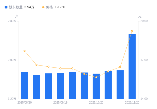 近一年(2024年11月20日至2025年11月20日),同益股份A股股东户数从2.04万户,增加至2.54万户,增幅24.03%,区间股价上涨9.93%。