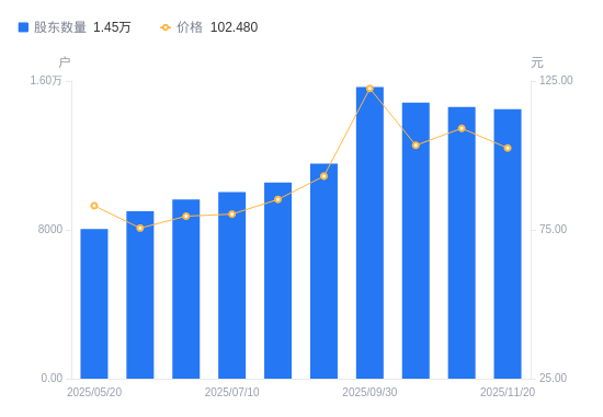 近一年(2024年11月29日至2025年11月20日),中熔电气A股股东户数从7019户,增加至1.45万户,增幅106.34%,区间股价上涨43.16%。