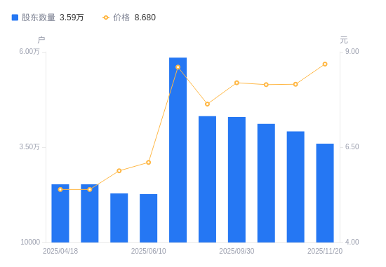 近一年(2024年12月20日至2025年11月20日),准油股份A股股东户数从2.54万户,增加至3.59万户,增幅41.23%,区间股价上涨55.83%。