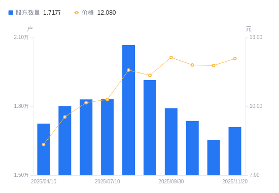 近一年(2024年11月29日至2025年11月20日),华新环保A股股东户数从1.91万户,减低至1.71万户,降幅10.28%,区间股价上涨25.70%。