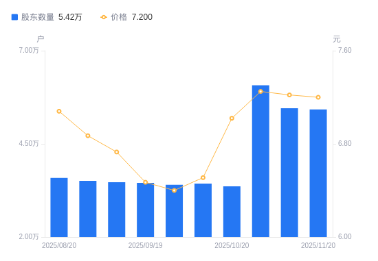 近一年(2024年11月20日至2025年11月20日),石化机械A股股东户数从2.95万户,增加至5.42万户,增幅83.94%,区间股价上涨20.60%。