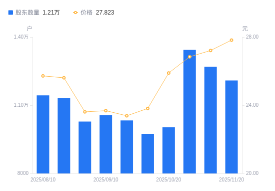 近一年(2024年11月20日至2025年11月20日),永泰运A股股东户数从1.11万户,增加至1.21万户,增幅8.61%,区间股价上涨39.44%。