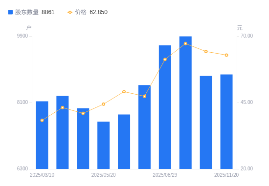 近一年(2024年11月10日至2025年11月10日),日联科技A股股东户数从7121户,增加至8821户,增幅23.87%,区间股价上涨60.84%。