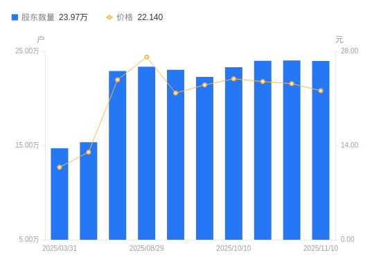 近一年(2024年12月31日至2025年10月31日),盛和资源A股股东户数从15.15万户,增加至24.02万户,增幅58.60%,区间股价上涨120.65%。