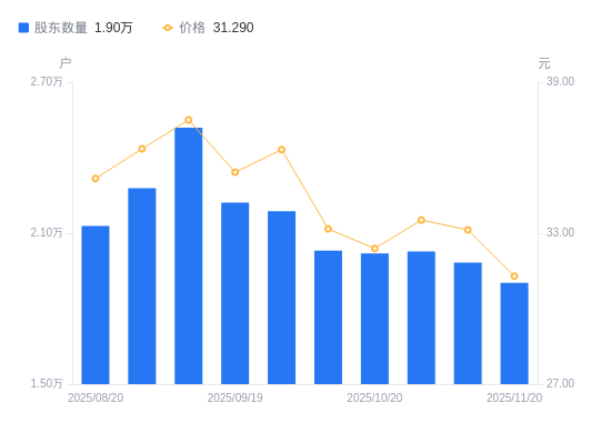 近一年(2024年11月20日至2025年11月20日),领湃科技A股股东户数从1.06万户,增加至1.9万户,增幅80.05%,区间股价上涨42.62%。