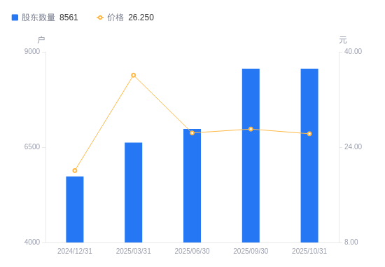 近一年(2024年12月31日至2025年10月31日),致远互联A股股东户数从5732户,增加至8561户,增幅49.35%,区间股价上涨24.82%。