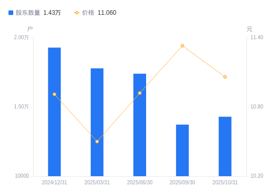近一年(2024年12月31日至2025年10月31日),兆讯传媒A股股东户数从1.93万户,减低至1.43万户,降幅25.89%,区间股价下跌2.73%。