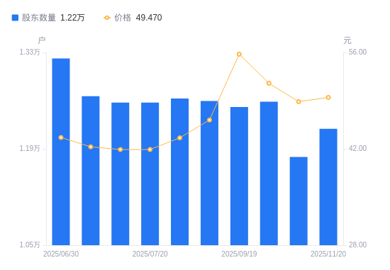 11月27日消息,数据显示,截至2025年9月19日,华亚智能A股股东总户数为1.25万户,较上期(2025年8月10日)减少87户,降幅0.69%。公司最新A股总股本为1.34亿股,其中流通A股7983.05万股,户均持有流通A股数量为6382.87股,较上期增加44.09股,增幅0.70%;户均持流通A股市值35.58万元,较上期增加6.31万元,增幅21.54%。