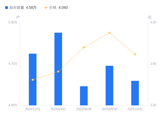 近一年(2024年12月31日至2025年10月31日),珈伟新能A股股东户数从4.77万户,减低至4.58万户,降幅4.13%,区间股价上涨7.16%。