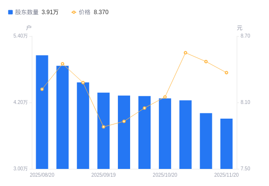 近一年(2024年12月31日至2025年11月20日),九鼎新材A股股东户数从3.57万户,增加至3.91万户,增幅9.47%,区间股价上涨58.34%。