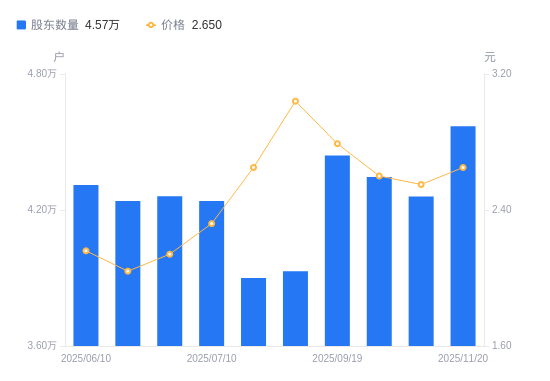近一年(2024年11月20日至2025年11月20日),福星股份A股股东户数从4.89万户,减低至4.57万户,降幅6.54%,区间股价下跌6.03%。