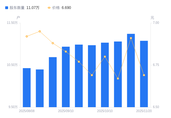 近一年(2024年11月20日至2025年11月20日),上海莱士A股股东户数从9.63万户,增加至11.07万户,增幅14.98%,区间股价下跌11.24%。