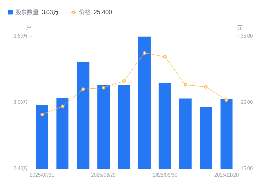 近一年(2024年11月20日至2025年11月20日),怡合达A股股东户数从1.77万户,增加至3.03万户,增幅71.51%,区间股价上涨2.34%。