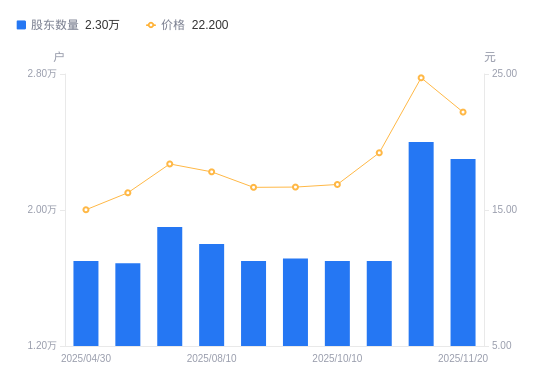 11月28日消息,数据显示,截至2025年11月10日,华兰疫苗A股股东总户数为2.4万户,较上期(2025年10月20日)增加7000户,增幅41.18%。公司最新A股总股本为6.01亿股,其中流通A股6.01亿股,户均持有流通A股数量为2.5万股,较上期减少1.03万股,降幅29.17%;户均持流通A股市值61.87万元,较上期减少5.99万元,降幅8.83%。