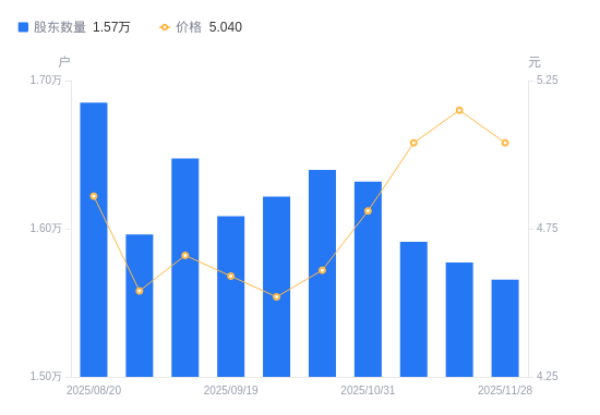 12月1日消息,数据显示,截至2025年11月28日,乔治白A股股东总户数为1.57万户,较上期(2025年11月20日)减少115户,降幅0.73%。公司最新A股总股本为5.05亿股,其中流通A股4.13亿股,户均持有流通A股数量为2.64万股,较上期增加192.54股,增幅0.73%;户均持流通A股市值13.31万元,较上期减少1913.15元,降幅1.42%。