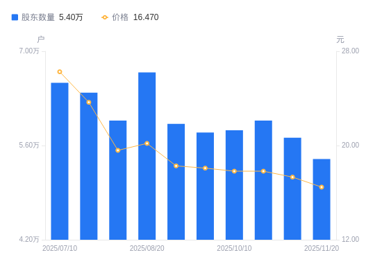 11月28日消息,数据显示,截至2025年11月20日,永安药业A股股东总户数为5.4万户,较上期(2025年10月31日)减少3155户,降幅5.52%。公司最新A股总股本为2.95亿股,其中流通A股2.46亿股,户均持有流通A股数量为4547.91股,较上期增加251.07股,增幅5.84%;户均持流通A股市值7.49万元,较上期增加482.89元,增幅0.65%。