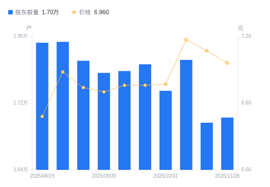 近一年(2024年12月31日至2025年11月28日),龙利得A股股东户数从2.27万户,减低至1.7万户,降幅25.12%,区间股价上涨27.01%。