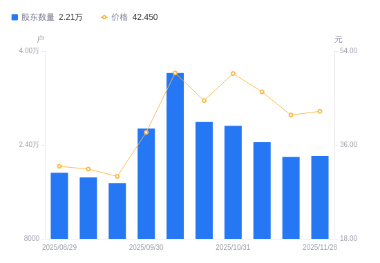 近一年(2024年11月29日至2025年11月28日),哈焊华通A股股东户数从1.15万户,增加至2.21万户,增幅92.25%,区间股价上涨138.75%。
