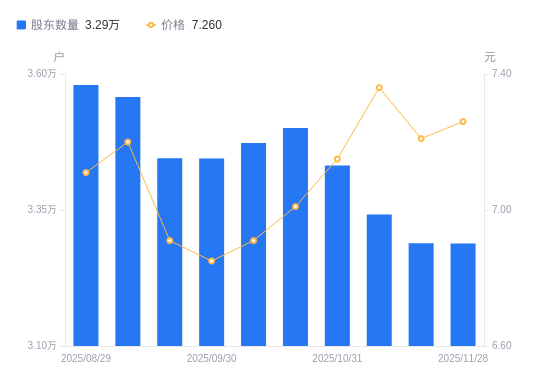 近一年(2024年11月29日至2025年11月28日),金陵药业A股股东户数从3.71万户,减低至3.29万户,降幅11.29%,区间股价上涨4.61%。