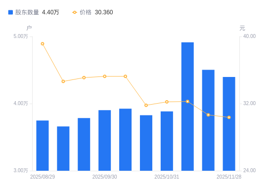 近一年(2024年11月29日至2025年11月28日),中简科技A股股东户数从3.42万户,增加至4.4万户,增幅28.61%,区间股价上涨14.56%。