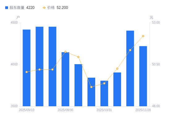 近一年(2024年11月29日至2025年11月28日),浙江正特A股股东户数从5964户,减低至4220户,降幅29.24%,区间股价上涨98.93%。