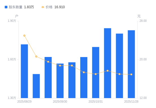 近一年(2024年11月30日至2025年11月28日),安利股份A股股东户数从1.29万户,增加至1.83万户,增幅41.80%,区间股价上涨8.65%。