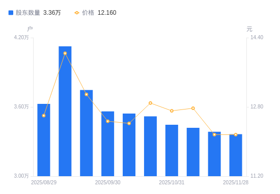 近一年(2024年11月29日至2025年11月28日),煌上煌A股股东户数从3.93万户,减低至3.36万户,降幅14.35%,区间股价上涨48.11%。