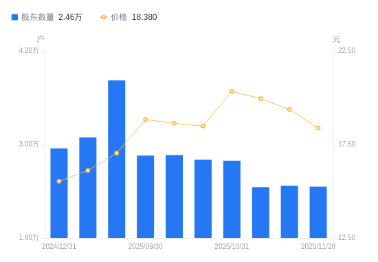 近一年(2024年12月31日至2025年11月28日),和胜股份A股股东户数从2.95万户,减低至2.46万户,降幅16.67%,区间股价上涨12.69%。