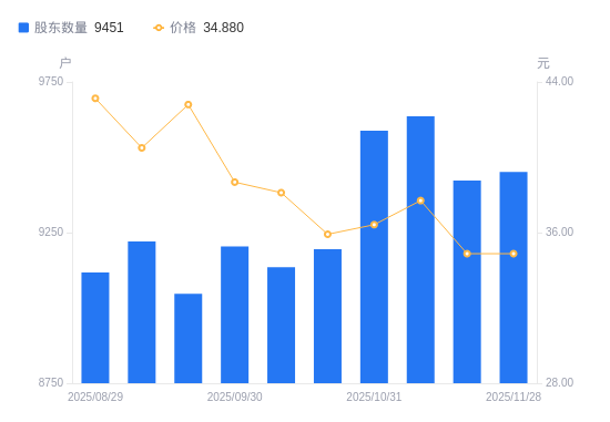近一年(2024年11月29日至2025年11月28日),朗特智能A股股东户数从1.64万户,减低至9451户,降幅42.21%,区间股价上涨13.91%。