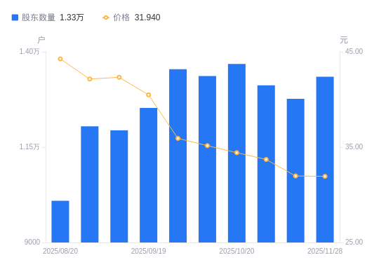 近一年(2024年11月29日至2025年11月28日),海泰科A股股东户数从8964户,增加至1.33万户,增幅48.91%,区间股价上涨41.89%。