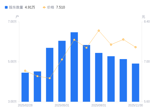 近一年(2024年11月30日至2025年11月30日),新北洋A股股东户数从4.57万户,增加至4.91万户,增幅7.32%,区间股价上涨6.46%。