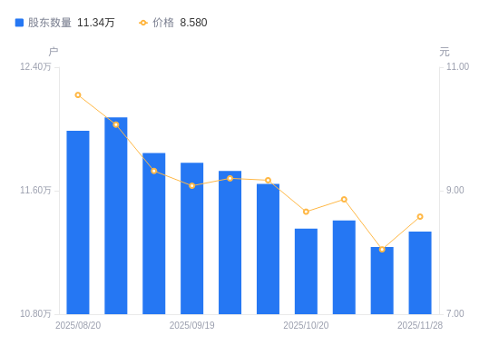 近一年(2024年11月29日至2025年11月28日),卫宁健康A股股东户数从7.72万户,增加至11.34万户,增幅46.91%,区间股价上涨10.92%。