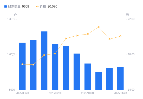 近一年(2024年11月29日至2025年11月28日),致远新能A股股东户数从1.19万户,减低至9608户,降幅19.42%,区间股价上涨3.77%。