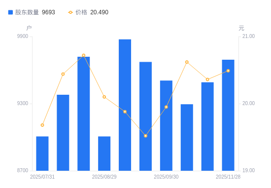 近一年(2024年11月30日至2025年11月28日),坤泰股份A股股东户数从1.14万户,减低至9693户,降幅15.09%,区间股价上涨22.96%。