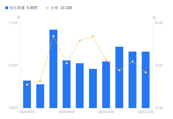 12月1日消息,数据显示,截至2025年11月28日,恒邦股份A股股东总户数为6.08万户,较上期(2025年11月20日)增加894户,增幅1.49%。公司最新A股总股本为13.79亿股,其中流通A股11.42亿股,户均持有流通A股数量为1.88万股,较上期减少280.21股,降幅1.47%;户均持流通A股市值24.26万元,较上期减少7050.84元,降幅2.82%。