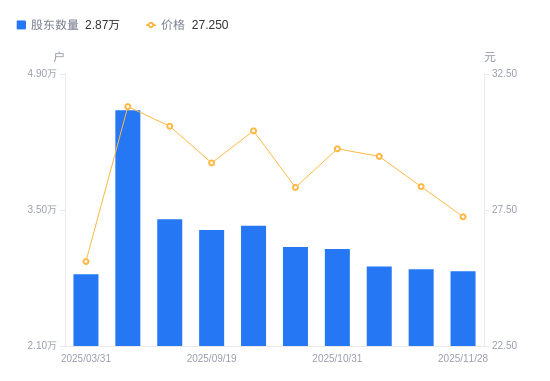 12月1日消息,数据显示,截至2025年11月28日,东方中科A股股东总户数为2.87万户,较上期(2025年11月20日)减少204户,降幅0.71%。公司最新A股总股本为3亿股,其中流通A股2.35亿股,户均持有流通A股数量为8192.34股,较上期增加57.83股,增幅0.71%;户均持流通A股市值22.32万元,较上期减少7453.43元,降幅3.23%。