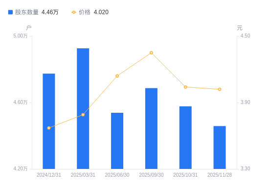 近一年(2024年12月31日至2025年11月28日),珈伟新能A股股东户数从4.77万户,减低至4.46万户,降幅6.64%,区间股价上涨6.63%。