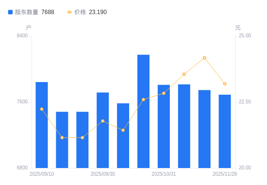 近一年(2024年11月29日至2025年11月28日),超越科技A股股东户数从9756户,减低至7688户,降幅21.20%,区间股价下跌13.79%。