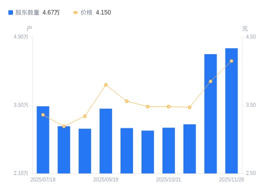 近一年(2024年12月10日至2025年11月28日),赫美集团A股股东户数从3.1万户,增加至4.67万户,增幅50.65%,区间股价上涨0.97%。