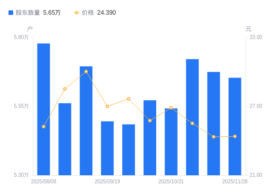 近一年(2024年11月29日至2025年11月28日),太极股份A股股东户数从5.76万户,减低至5.65万户,降幅1.77%,区间股价下跌6.04%。