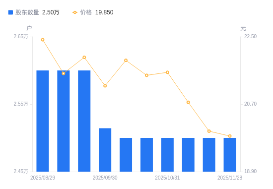 近一年(2024年11月29日至2025年11月28日),瑞普生物A股股东户数从1.6万户,增加至2.5万户,增幅56.25%,区间股价上涨1.24%。