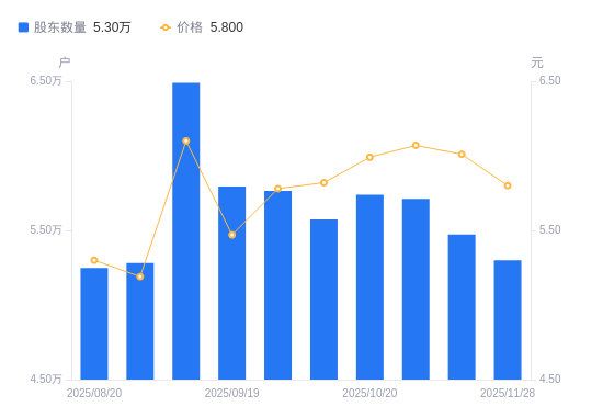 近一年(2024年12月10日至2025年11月28日),通源石油A股股东户数从3.5万户,增加至5.3万户,增幅51.26%,区间股价上涨18.13%。