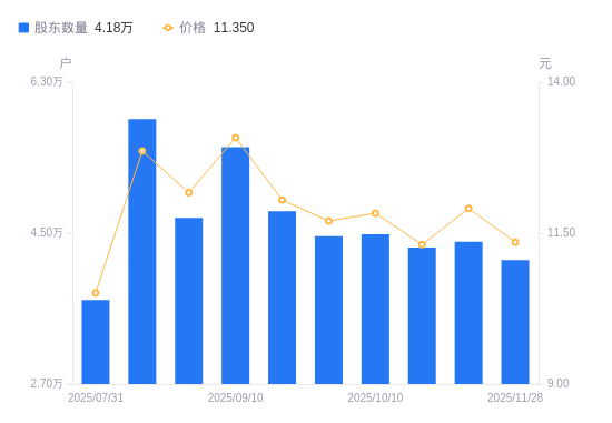 近一年(2024年11月29日至2025年11月28日),山东章鼓A股股东户数从4.17万户,增加至4.18万户,增幅0.30%,区间股价上涨5.29%。