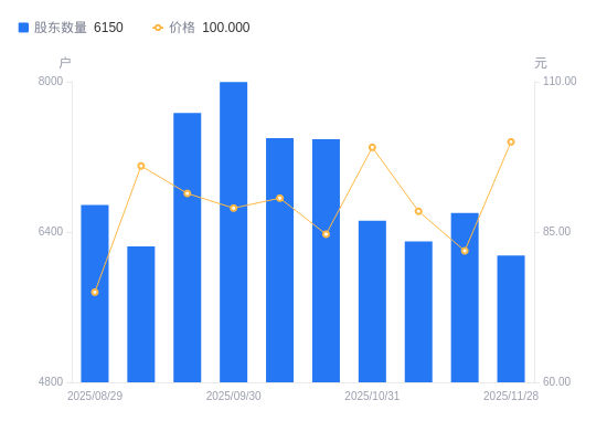 近一年(2024年11月29日至2025年11月28日),恒勃股份A股股东户数从8585户,减低至6150户,降幅28.36%,区间股价上涨267.00%。
