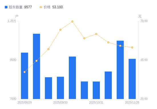 近一年(2024年11月29日至2025年11月28日),锡装股份A股股东户数从1.07万户,减低至9577户,降幅10.74%,区间股价上涨46.24%。