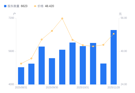近一年(2024年12月31日至2025年11月28日),绿岛风A股股东户数从5711户,增加至6623户,增幅15.97%,区间股价上涨74.99%。