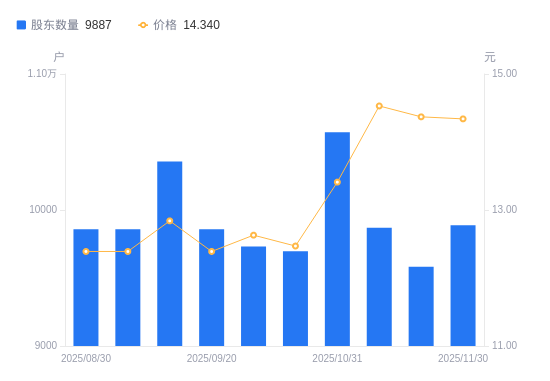 近一年(2024年12月10日至2025年11月30日),播恩集团A股股东户数从1.23万户,减低至9887户,降幅19.80%,区间股价上涨15.83%。