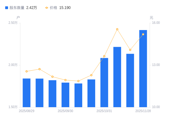近一年(2024年11月29日至2025年11月28日),亨迪药业A股股东户数从1.74万户,增加至2.42万户,增幅38.87%,区间股价上涨13.07%。