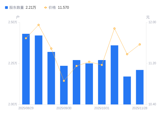 近一年(2024年11月29日至2025年11月28日),西部牧业A股股东户数从2.42万户,减低至2.21万户,降幅8.68%,区间股价上涨14.10%。