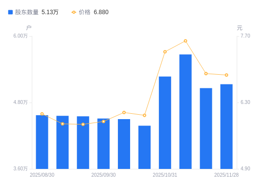 近一年(2024年11月29日至2025年11月28日),新联电子A股股东户数从4.58万户,增加至5.13万户,增幅12.01%,区间股价上涨64.59%。